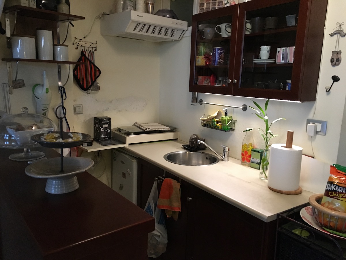 A kitchen with everything you need: stovetop, refrigerator, dishwasher, microwave, espresso machine. Only the family apartment has a kitchen