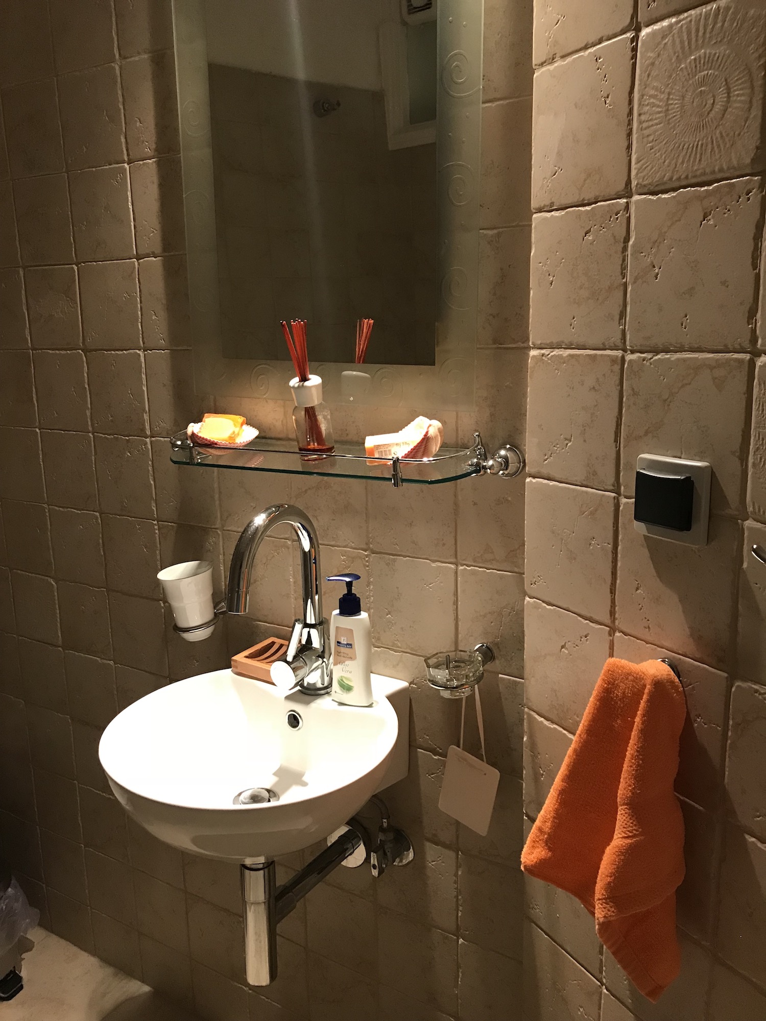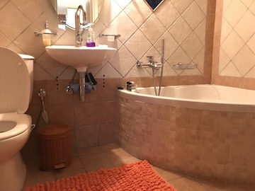 Main bathroom covered with tiles and offering all toiletries.